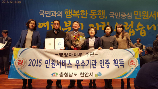 충남 천안시가 행정자치부로부터 2015년도 민원서비스 우수기관 인증 지자체로 선정돼 3일 한국철도공사2층대강당에서 열린 민원공무원의 날 행사에서 인증서를 받았다.
