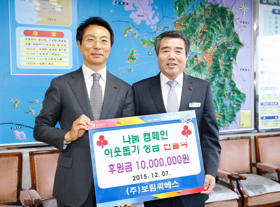 (주)보림씨에스 정종천 대표는 이웃돕기 성금 일천만원을 기탁했다. (주)보림씨에스는 지난 2005년 설립된 폐기물최종처리업체로 지난해에도 웅천녹색행복위원회에 불우이웃돕기 성금으로 일천만원을 기탁하는 등 지역주민과 함께 동반성장을 위해 노력해 오고 있다.