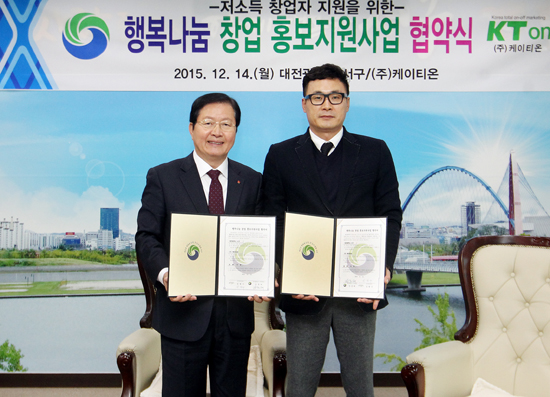 대전 서구가 14일 구청 다목적실에서 ㈜케이티온(대표 설형수)와 '행복나눔 저소득층 창업자 홍보지원사업 협약'을 체결했다.