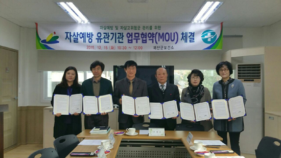 보건소는 그동안 경찰서와 교육지원청, 소방서, 우체국, 자원봉사센터 등 8개 기관을 비롯해 이날 (사)대한노인회 예산군지부, 예산군장애인종합복지관, 예산군청소년상담복지센터 등 7개 기관과 군민의 정신건강을 증진하고 위기상황에 공동대처하며 자살 시도자에 대한 사후 지원 등 자살예방 안전망을 구축하기 위한 업무협약을 체결했다.