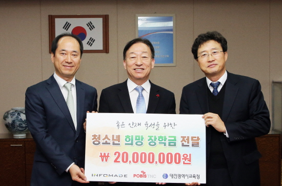 대전교육청이 21일(월) 오전 교육청 접견실에서 ㈜인포메이드(대표 조성삼) 및 ㈜포비스티앤씨(대표 허한범)로부터 인재육성 장학금 2천만 원을 기탁 받았다.