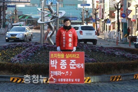 역전 로터리에서 거리인사를 하는 박 예비후보의 표지물에는 “조치원을 살리라고 박종준에게 전해라~!”라는 독특한 유행문구가 적혀있어 지나가는 주민들의 눈길을 끌었다.