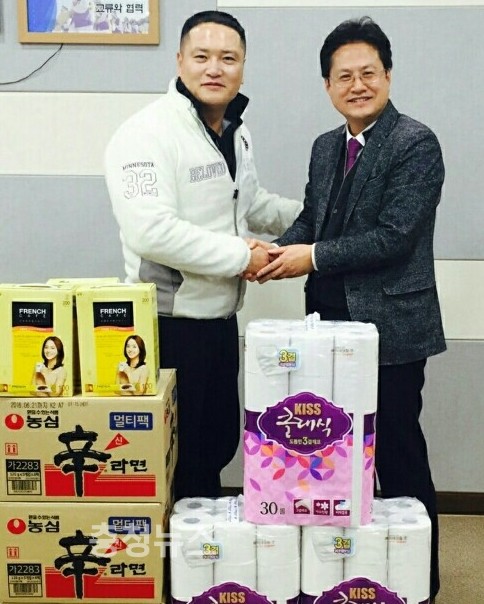 ▲ 이영찬 타이거짐 대표(좌)가 설 명절을 맞아 아산시 탕정면 면사무소를 방문 선우문 탕정면장(우) 불우이웃돕기 물품 전달/충청뉴스 최형순 기자