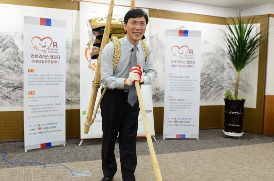 안희정 충남도지사는 12일 집무실에서 ‘러브 라이스 챌린지(사랑의 쌀 도전 릴레이)’ 다섯 번째 주자로 나서 청풍명월 골드 쌀 500㎏을 기부했다.