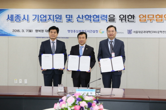 세종특별자치시(시장 이춘희)와 행정중심복합도시건설청(청장 이충재)이 7일 11시 서울대 공과대학(학장 이건우) SNU공학컨설팅센터(센터장 남경필)와 세종시 기업지원을 위한 산학협력에 관한 협약을 체결했다.