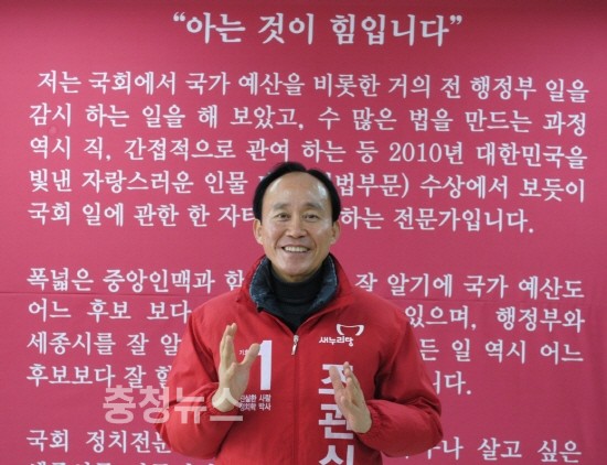 그런 그가 새누리당 소속으로 국회의원 배지를 달고 고향 세종 발전을 위해 헌신하겠다는 것이다. 이를 위해 조 예비 후보는 우선 국회의 업무를 잘아야 하고 힘 있는 정당이 필요하다고 생각해 새누리당을 선택했다는 게 그의 설명이다.
