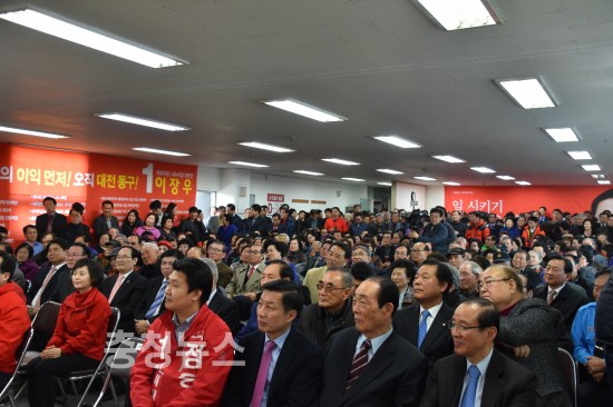 한편 이날 개소식에는 최경환 전 경제부총리를 비롯해 이인제 최고위원, 김태호 최고위원, 정우택 의원, 박덕흠 의원, 정용기 의원, 민병주 의원, 이양희 전 국회의원, 박성효 전 대전시장, 김남욱 전 대전시의회 의장, 이은권 예비후보, 이영규 예비후보, 이재선 예비후보, 윤석대 예비후보, 안필응 시의원 유택호 동구의회 의장, 박선용 동구의회 부의장, 최선희 대전시의원 송석락 前동구의장, 김종성 前동구의장, 남진근 前시의원, 오관영 동구의원, 등 정치인사들과 각계 각층의 관계자들, 지지자들이 대거 참석해 성황을 이뤘다.