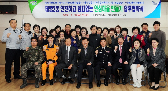 대전 중구(구청장 박용갑) 태평2동주민센터(동장 김진태)는 16일 동주민센터에서 민·관·군·경이 함께하는 ‘안전하고 범죄없는 안심마을 만들기’ 협약을 체결했다.