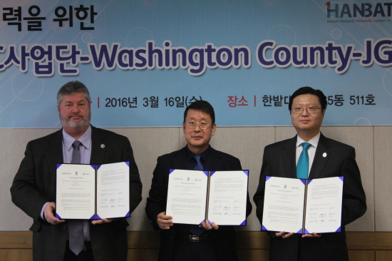 한밭대학교 산학협력선도대학육성사업단(사업단장 김광주, 이하 LINC사업단)이 16일(수) 미국 메릴랜드주 워싱턴카운티(군수 그렉 머레이, 이하 워싱턴카운티), JG Business Link International(회장 이근선, 이하 JG BLI)과 글로벌 산학협력 활성화와 확산을 위한 MOU를 체결했다.