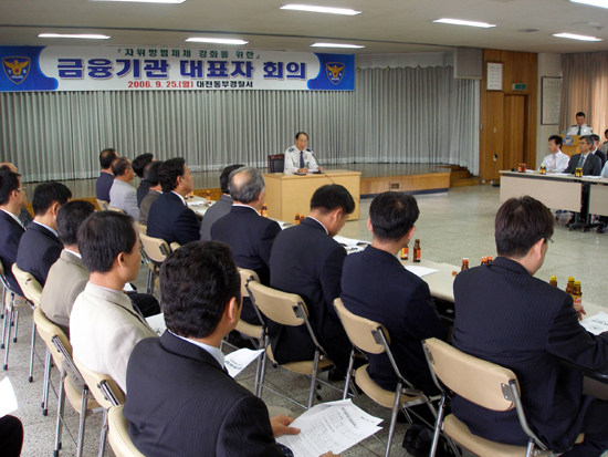 대전동부경찰서(서장 오은수)는 25일 관내 금융기관 대표 125명을 초청 '자위방범 강화를 위한 금융기관 대표자 회의'를 개최하고 안전한 추석절을 위한 자체경비원 증원 배치, 외곽 CCTV보강, 현금수송 기본안전수칙 등을 준수해줄 것을 당부했다. 저작권자 © 충청뉴스 무단전재 및 재배포 금지 김거수 기자 다른기사 보기 기사가 마음에 드셨나요? 충청뉴스 좋은 기사 후원하기 1,000원 3,000원 5,000원 10,000원 30,000원 50,000원 직접입력 비회원 약관동의하기 ※ 소중한 후원금은 더 좋은 기사를 만드는데 쓰겠습니다.