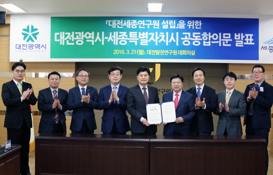 대전시와 세종시가 21일 오후 3시, 대전발전연구원 대회의실 (구 충남도청사)에서 권선택 대전광역시장과 이춘희 세종특별자치시장이 참석한 가운데 「대전세종연구원」 설립을 위한 공동합의문을 발표하고 본격적인 연구원 설립절차에 돌입한다고 밝혔다.