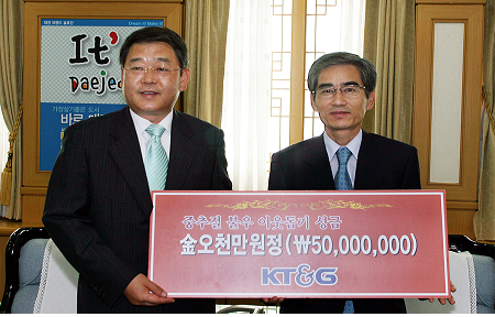 KT&G(사장 박영준) 양세정 경영관리본부장은 26일 오전 10시 박성효 대전광역시장을 예방해 불우이웃돕기 성금 5천만원을 기탁하고 5개 구청에도 각각 1천만원의 성금을 기탁했다.