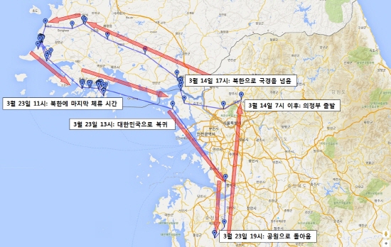 GPS상 행선지, 북한 황해도 개성시(14일)와 개풍군, 해주시, 안악군(15일)등지