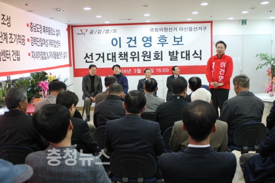 제20대총선 총선 아산시 을선거구에 출마한 새누리당 이건영 후보는 공식선거운동 시작을 5일 앞둔 26일(토) 배방 선거사무실에서 선거대책위원회 구성을 통한 위촉장 수여 및 발대식을 갖고 을선거구에서 새누리당의 승리와 이건영후보의 압승을 다짐했다.