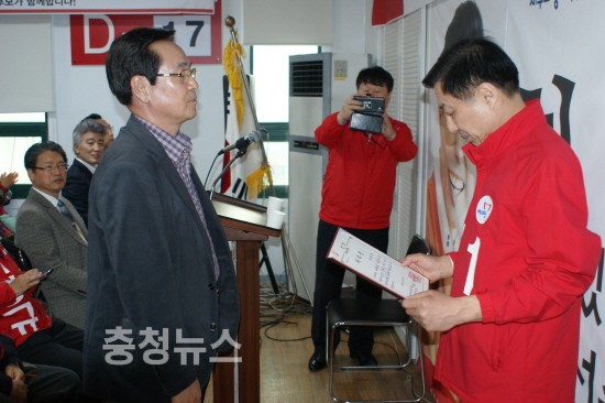 ▲ 이재선 서구을 후보, 선거대책본부 발대식에서 당내 경선 경쟁자였던 조성천 후보가 공동 선거대책위원장으로 위촉됐다.
