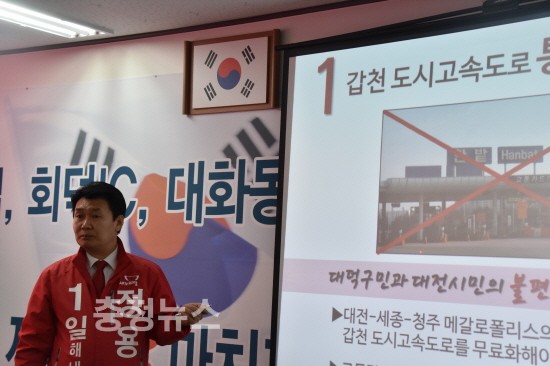 새누리당 정용기 대전 대덕구 국회의원 후보가 갑천 도시고속도로 통행료를 폐지하겠다고 밝혀 주목을 끌고 있다.