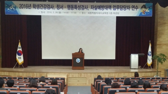 세종시교육청(교육감 최교진)은 28일 시교육청 대강당에서 학생건강검사, 정서행동·특성검사, 자살예방대책 등 건강증진 업무담당자를 대상으로 ‘2016년 건강증진 업무담당자 역량강화 연수’를 실시했다.