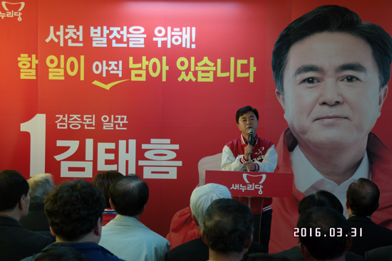 새누리당 김태흠 후보가 20대 국회의원 선거 공식 선거운동 첫날 인 31일 오후 서천 선거연락사무소 개소식을 개최하며 선거운동을 시작했다.