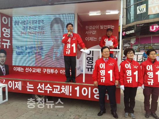 기호1번 새누리당 대전 서구갑 이영규 국회의원 후보가 제20대 총선 공식선거운동이 시작된 31일 “ 16년간 국회의원 선수만 채운 박병석 후보에 대한 주민들의 피로감이 극에 달해 있다”며 “이번에는 반드시 국회에 입성해 정치문화를 바꾸고 새로운 국회의원상을 정립하겠다”고 포문을 열렀다.