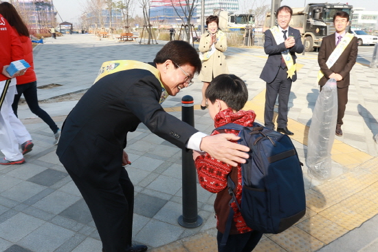 이와 함께, 이날 시교육청 직원들은 ‘첫 등교를 축하합니다’라는 문구가 적힌 어깨띠를 착용하고 학교 앞 횡단보도 등에서 첫 등교 학생과 학부모를 대상으로 등굣길 안내와 교통지도를 펼쳤다.