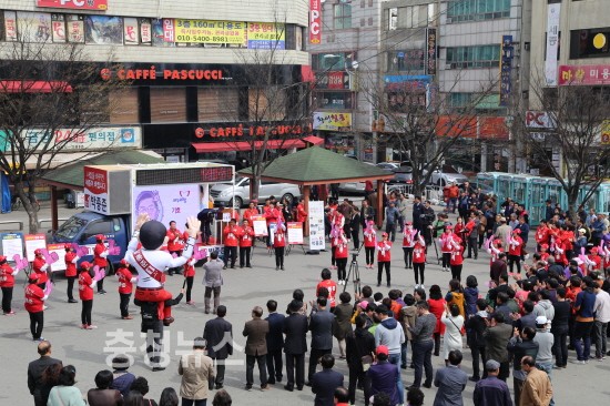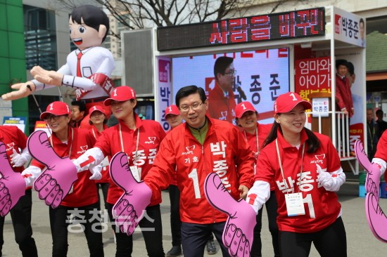 새누리당 박종준 세종시 국회의원 후보가 20대 총선 선거유세 첫날부터 대형인형 등 다른 캠프와는 차별화된 유세물품과 퍼포먼스를 선보이며 시민들의 관심을 끌고 있다.