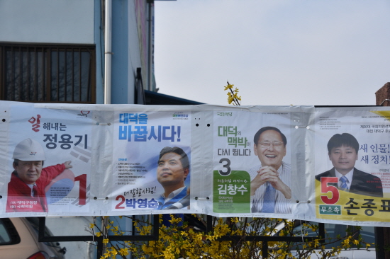 국민의당 김창수 후보는 ‘대덕의 맥박이 다시 뜁니다’라는 문구를 내걸었고 무소속 손종표 후보는 ‘새인물 새정치!’를 주장하며 유권자들에게 표심을 호소하고 있다.