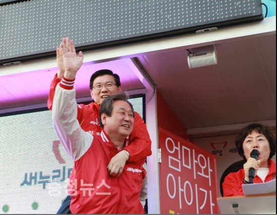 ▲ 4.13 총선을 8일 앞두고 충청권 공략에 나선 김무성 새누리당 대표가 5일 세종시 조치원역에서 열린 박종준 후보(세종) 지원유세에서 박 후보를 등에 업어주고 있다. / 충청뉴스 최형순 기자