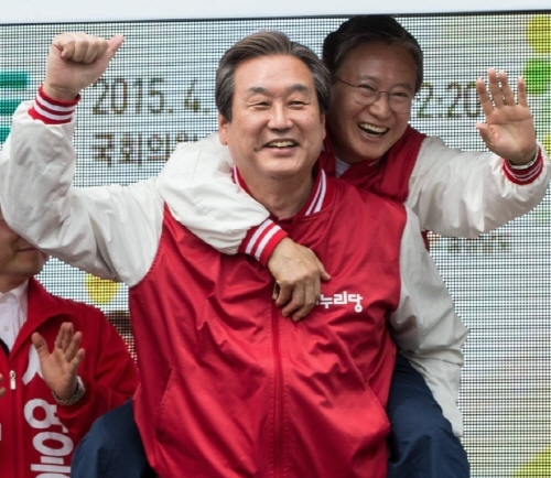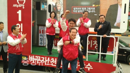 ▲ 김무성 대표가 천안병 이창수 후보를 엎고 지지를 호소하고 있다.