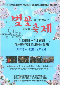 충남 아산시 음봉면 충무권역영농조합과 아산온천발전협의회에서는 공동으로 벚꽃이 만개하는 4월 12일(화)부터 17일(일)까지 아산온천관광단지 일원에서 ‘2016 아산시 제97회 전국체전, 제36회 장애인체전 성공기원’ 벚꽃축제를 개최한다.