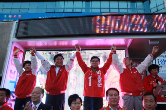 원유철 새누리당 원내대표가 8일 세종시 조치원 역전을 찾아 시민들과 함께하고 박종준 후보의 유세를 지원했다.