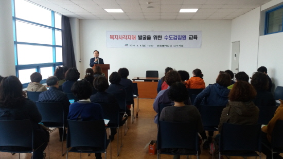 맑은물사업소 2층 회의실에서 열린 수도검침원 교육에서는 최종재 복지정책과장이 수도검침원 35명을 대상으로 ‘찾아주세요! 알려주세요! 소외된 우리이웃’이라는 주제로 교육을 실시했다.