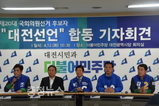 더불어민주당 대전시당이 하루 앞으로 다가온 총선에서 4~5석을 반드시 확보하겠다는 의지를 밝혔다. 시당은 12일 오전 ‘대전선언’ 합동 기자회견을 열고 “대전 경제의 새로운 미래를 이끌어갈 유능한 후보, 대전을 새로운 중심으로 우뚝 세울 뚝심 있는 후보가 누구인지 대전시민께서 투표해달라”며 “더불어민주당에 힘을 모아달라”고 읍소했다.