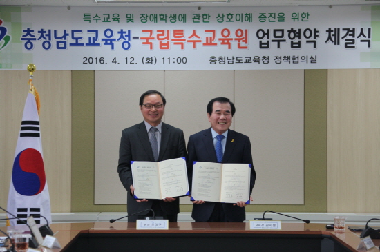 충남도교육청(교육감 김지철)은 12일 본청 정책협의실에서 특수교육 관계자 15명이 참석한 가운데 충남 특수교육 및 장애학생에 관한 상호이해 증진을 위해 국립특수교육원(원장 우이구)과 업무협약을 체결했다.