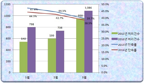 시는 2016년 1월~3월 기간 중 처리한 민원건수는 2,620건으로 2015년 1분기 대비 531건 증가(25.4%) 하였고, 민원처리기간 단축률은 41.6%로 2015년 1분기 대비 1.3%로 소폭 감소하였으나 2016년 1분기 운영결과는 ‘양호’한 것으로 자체평가 했다.