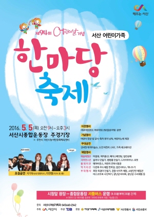 충남 서산시는 오는 5월 5일 제94회 어린이날을 맞아‘서산 어린이가족 한마당 축제’개최하고 TJB 대전방송의 주관으로 열리는 이번 행사는 많은 단체와 기관이 참여하고 어린이들과 시민들이 함께 어울릴 수 있는 다양한 체험의 장으로 마련된다고 밝혔다.