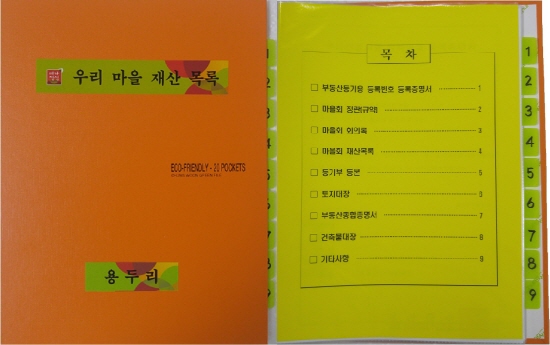 바인더에는 ▲부동산등기용 등록번호 등록증명서 ▲마을회 정관(규약) ▲마을회 회의록 ▲마을회 재산목록 ▲등기부 등본 ▲토지대장 ▲부동산종합증명서 ▲건축물 대장 등 8종의 자료가 수록됐다.