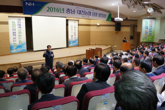 김병원 농협중앙회장은 5월 2일(월) 세종시 소재 농협보험교육원에서 열린 「충남·대전농협 상생발전대회」에 참석해 대전·충남 관내 조합장 및 유찬형 충남농협 본부장, 박송현 대전농협 본부장 등 시군지부장과 계열사 임직원 200여명을 대상으로 협동조합이념 특별강연 및 농업현장 보고회를 갖고 농업인 지원정책 건의사항 청취 및 농·축산업 당면과제 등에 대해 폭 넓은 대화의 시간을 가졌다.