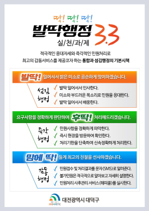 통합과 섬김을 기본으로 하는 ‘발딱! 섬김행정, 후딱! 즉각행정, 맘에 딱! 감동행정’을 실현하는 ‘발딱행정 3.3실천과제’를 선정하여 리플릿을 제작, 실천하고 있는 『발딱행정』을 상표등록 함으로써 대덕구 고유의 민원행정서비스로 브랜드화 하여 사용하게 됐다.