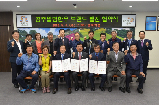 충남 공주시(시장 오시덕)가 4일 공주시청 중회의실에서 오시덕 공주시장을 비롯한 세종공주축산업협동조합과 백제나루 영농조합법인 관계자 등이 참석한 가운데 공주시 한우브랜드인 ‘공주알밤한우’에 대한 브랜드 발전 협약식을 가졌다고 밝혔다.