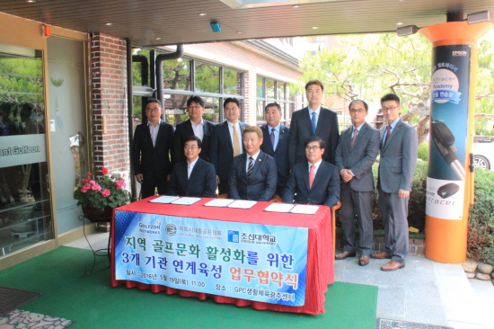 이날 협약식에는 골프존네트웍스 정주명 사업본부장, 윤정훈 영업지원실장, 조선대 윤오남 스포츠산업학과장, GPC대중골프협회 유창식 협회장 등 10여 명이 참석했다.