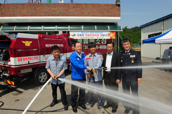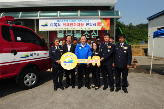 충남 예산군은 20일 대흥면 동부지역대 청사에서 황선봉 군수를 비롯해 성백문 대흥면동부지역대장과 대원 20여명이 참석한 가운데 다목적화재진화차량 전달식을 가졌다고 밝혔다.