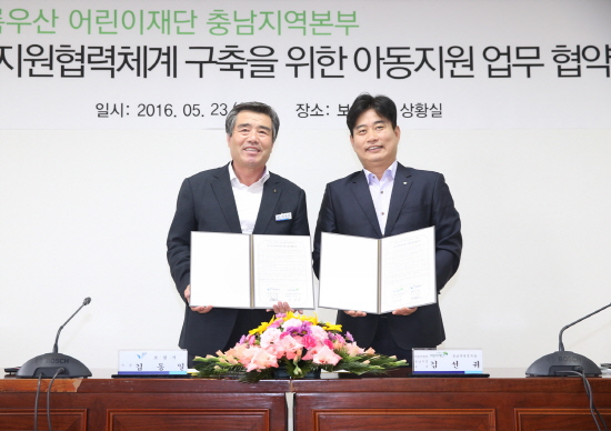 충남 보령시와 초록우산어린이재단 충남지역본부가 23일 시청 상황실에서 김동일 시장과 김선귀 본부장 등 관계자 10여 명이 참석한 가운데 빈곤아동 지원협력체계 구축을 위한 ‘아동지원 업무 협약식’을 체결했다고 밝혔다.