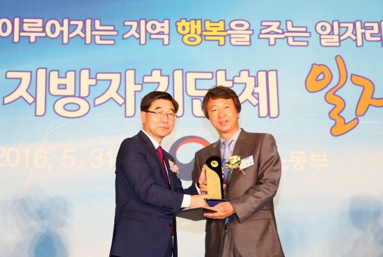 ▲ 31일 서울 코엑스에서 열린 ‘전국 지방자치단체 일자리대상’ 고용노동부 장관상 수상 장면 (사진제공- 유성구청)