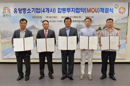 충남 공주시(시장 오시덕)는 15일 공주시청 중회의실에서 오시덕 시장을 비롯한 ㈜이지켐 등 4개 기업 대표 및 임직원이 참석한 가운데 합동 투자협약을 맺었다고 밝혔다.