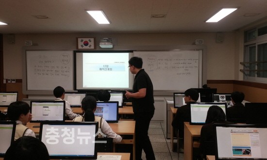 ▲ ‘앱 인벤터’ 교실에 참여한 학생들이 스마트폰 어플리케이션 개발 수업을 듣고 있다. / 충청뉴스 최형순 기자