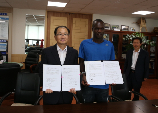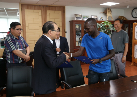 청양군(군수 이석화)은 지난 20일 군수실에서 세계적인 마라토너 윌슨 로야나에 에루페(28, 케냐, 한국명 오주한)와 재계약을 체결했다고 밝혔다.