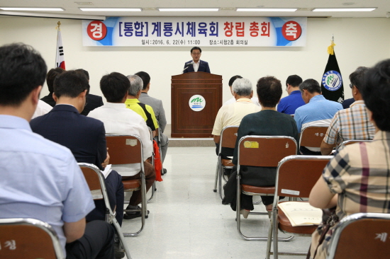 충남 계룡시(시장 최홍묵)는 22일 시청 회의실에서 최홍묵 시장을 비롯한 종목별 단체장과 면·동 체육회장, 통합추진위원 등 50여명이 참석한 가운데 통합체육회 창립총회를 개최했다고 밝혔다.