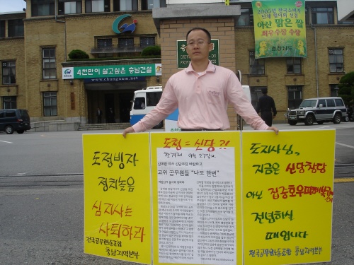 국감이 시작되기 전부터 충남도청 정문앞에서는 공무원 노조의원의 1인 시위가 벌어졌다.