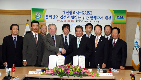 박성효 대전시장과 서남표 KAIST총장은 24일 오후 4시 KAIST 대회의실에서 '문화산업 경쟁력 강화를 위한 양해각서'를 체결했다. 이에 따라 시와 카이스트는 상호 공동사업을 통해 대전을 문화와 과학, 체험교육이 어우러진 과학문화기술의 메카로 조성해 나갈 계획이다.