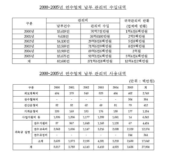 권 의원은 또, “중소기업중앙회가 외국인 노동자의 사후관리 명목으로 사업자들로부터 1인당 매년 8만원씩 받고 있는 사후관리비가 사실상 고스란히 중앙회 수입으로 전용되고 있는 것 아니냐”면서 “중소기업중앙회가 지난 2000년부터 6년간 이런 식으로 얻은 부당이득이 무려 371억원에 달하고, 중소기업중앙회가 매년 사업주들로부터 사후관리비를 꼬박꼬박 받으면서도 지난해 중소기업중앙회의 직접 상담 건수는 56건에 불과하다”고 질타했다.